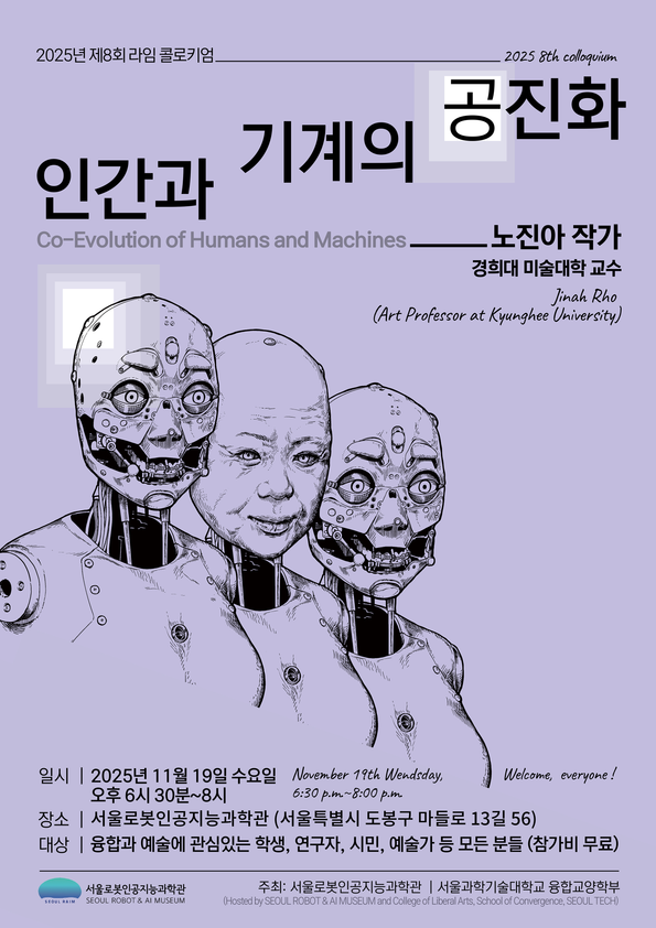 - 서울로봇인공지능과학관 2025 신규 미디어파사드 전시 한여름 밤, 빛으로 시작되는 이야기에 초대합니다 ✨ 📅 전시 기간 8.6 ~ 12.20 🕰 전시 시간 - 하절기: 20:00 ~ 22:00 - 동절기: 19:00 ~ 21:00 🏛️ 전시 장소 서울로봇인공지능과학관 정문 건축 외벽 ✨작품 설명 작품1 💫 빛으로 새긴 인공지능의 기억 과학관의 에너지로 깨어나는 디지털 시공간. 빛과 기억, 생명의 패턴이 교차하는 세계에서 과거와 미래가 연결되고, 시간은 새로운 미래를 예고합니다. 이 모든 흐름은, 인간과 로봇이 함께할 도시 서울을 향한 첫걸음입니다. 작품2 💃 공존의 형상 도시는 서로 다른 존재들이 기술과 감각을 통해 연결되는 살아 있는 플랫폼. 이제 로봇과 인공지능도, 인간과 함께 이 도시의 일상이 되었습니다. 기술을 매개로 소통하고, 공존하는 도시. 그 새로운 풍경을 지금 찬란한 빛 속에서 만나보세요. 작품3 🖋 RAIM TALK - 관람객 참여형 작품 서울로봇인공지능과학관의 원형 외벽은, 여러분과 함께 완성되는 하나의 캔버스입니다. QR코드를 스캔해 메시지를 남기면, 그 문장이 미디어파사드 위로 실시간 펼쳐집니다. 당신의 한 문장이 오늘 밤 서울의 빛이 됩니다.