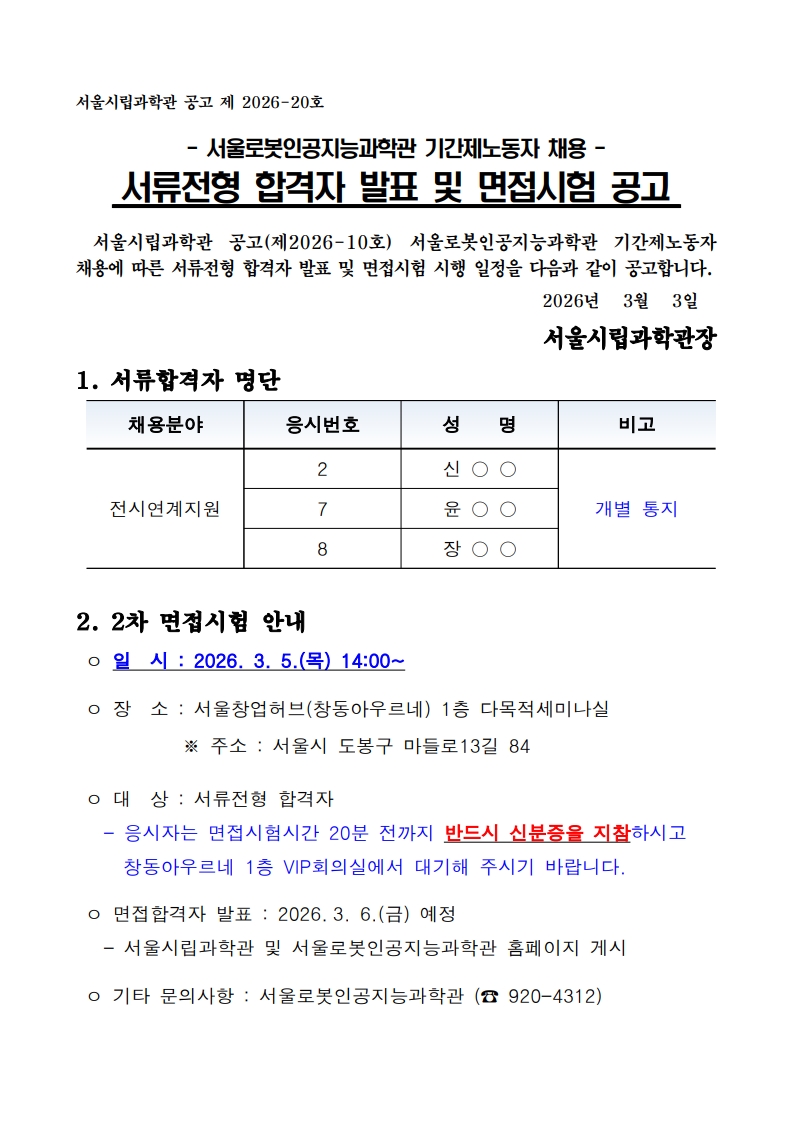 서울로봇인공지능과학관 기간제노동자 서류전형 합격자 및 면접시험 일정을 알려드리오니,