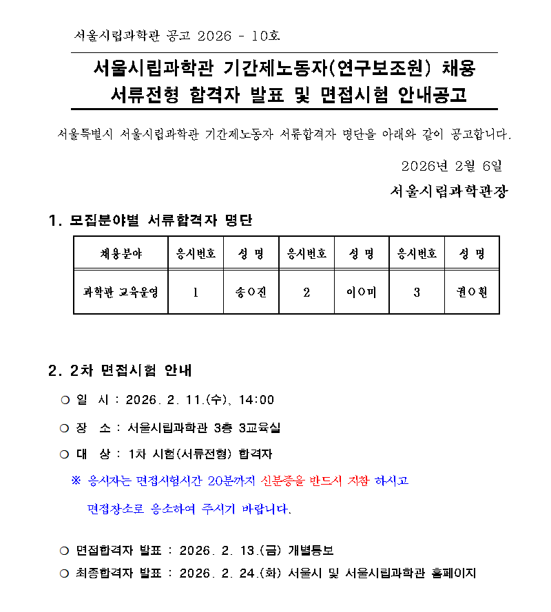 서울시립과학관 기간제노동자(연구보조원) 채용 서류전형 합격자 발표 및 면접시험 안내공고