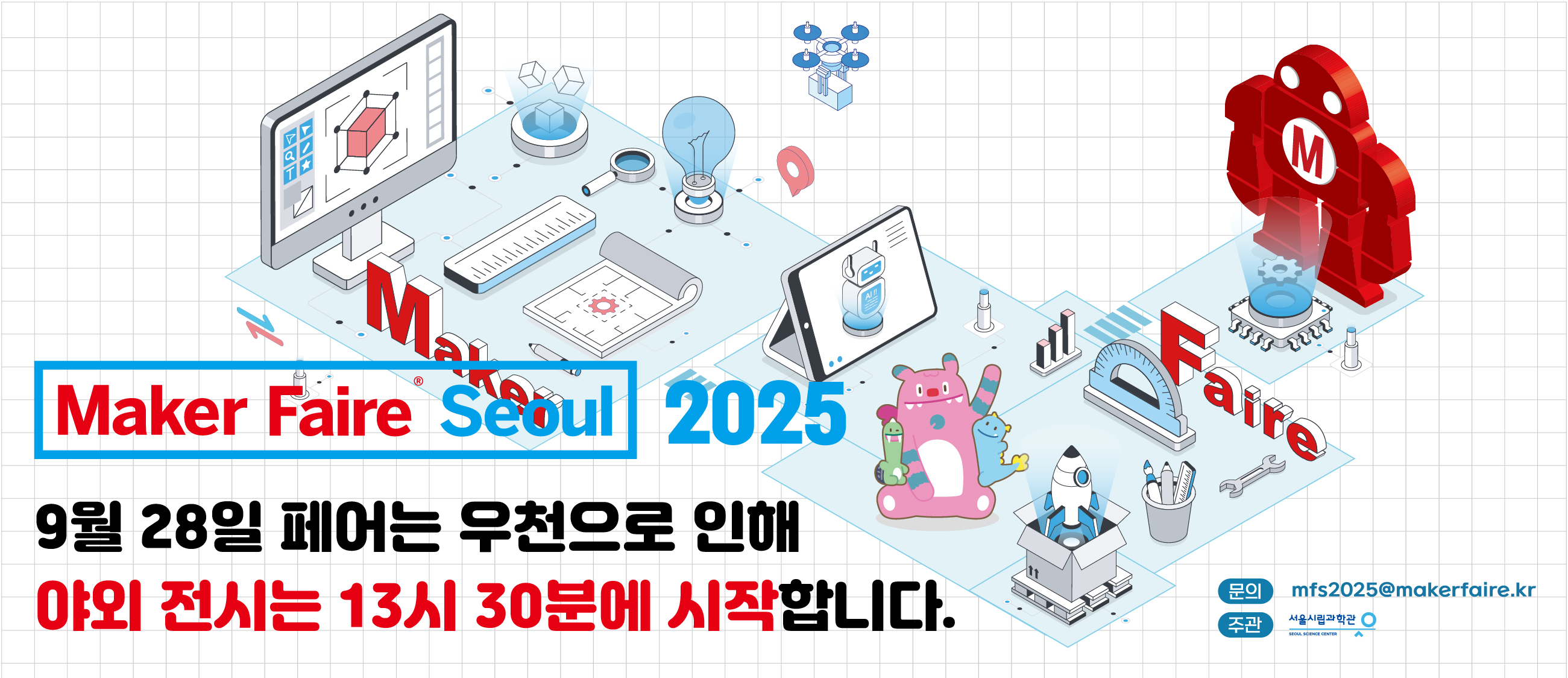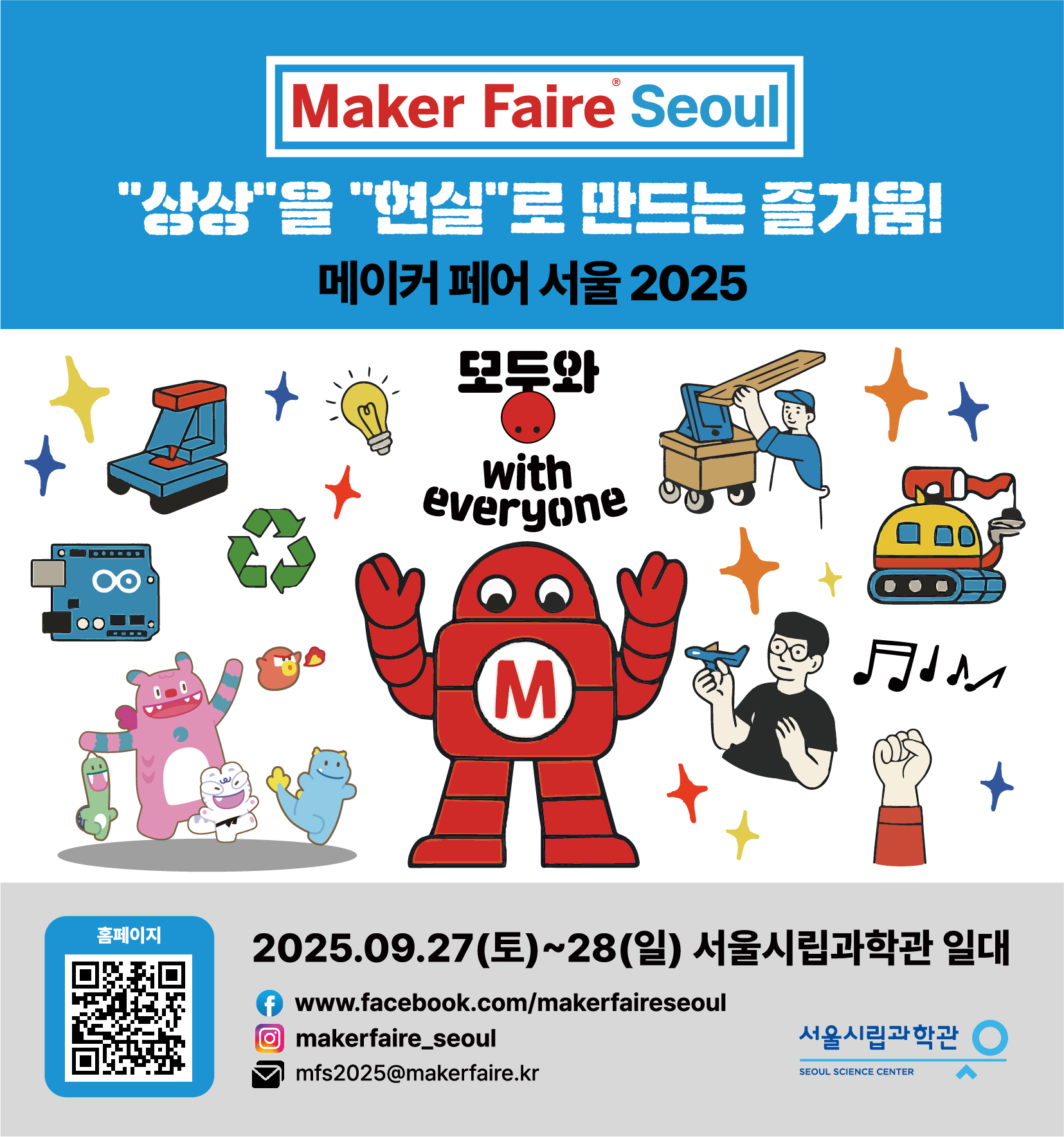 오는 2025년 9월 27일(토) ~ 28일(일) 양일간 서울시립과학관 일대에서 ‘메이커 페어 서울 2025’가 개최됩니다. 메이커 페어(Maker Faire)는 다양한 연령대의 기술자, 창작가, 교육자, 엔지니어, 작가, 아티스트 등의 메이커들이 직접 만든 프로젝트를 서로 공유하고 교류하며, 체험볼 수 있는 축제입니다. 2006년 캘리포니아 산 마테오에서 시작되어 매년 전 세계 약 40개 국에서 열리고 있으며, 서울시립과학관에서 미국 메이크 커뮤니티와의 독점 계약으로 지난 2023년부터 ‘메이커페어 서울’을 개최하면서, 메이커 문화를 확산하고, 시민들과 함께 ‘상상을 현실로 만드는 창작의 기쁨’을 누리고자 합니다.