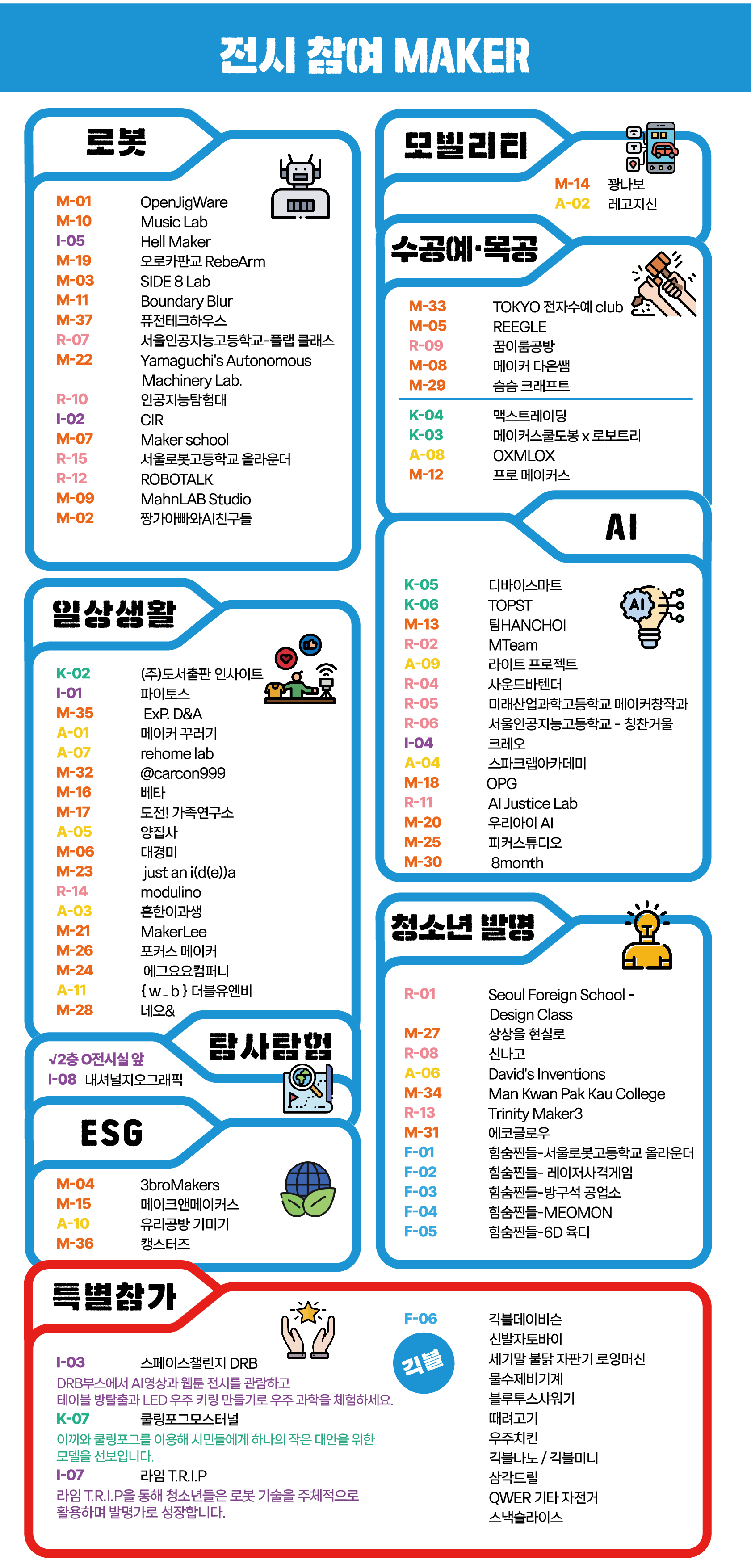 이번 ‘메이커 페어 서울 2025(Maker Faire Seoul)’는 AI·로봇 등 첨단기술 분야부터 목공, 수공예와 ESG, 지속가능발전 분야에 이르는 다채로운 분야에 걸쳐 기업 및 민간 창작자, 일반 메이커 등 100여팀이 한자리에 모여 자신만의 다양한 전시합니다. 뿐만 아니라, 메이커 페어 서울 11주년을 맞아 지난 메이커 페어를 돌아볼 수 있는 10주년 전시, 메이커 스포트라이트, 관람객이 참여 할 수 있는 체험워크숍, 스탬프이벤트, 재미있는 현장 공연 등이 준비됩니다.
