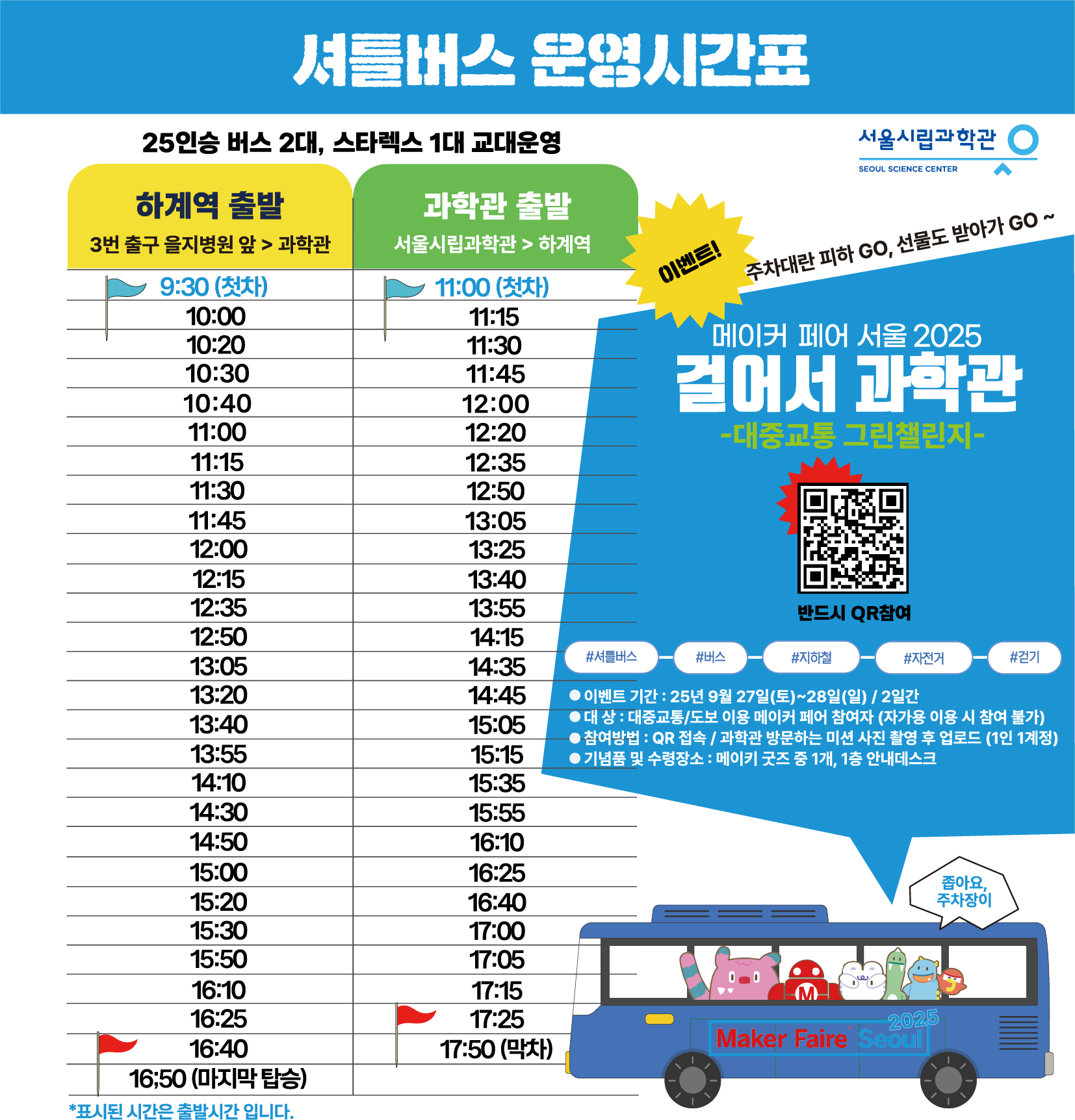 ※셔틀버스 수시 운행(배차 10~15분 간격, 하계역 3번 출구 앞 ↔ 과학관)