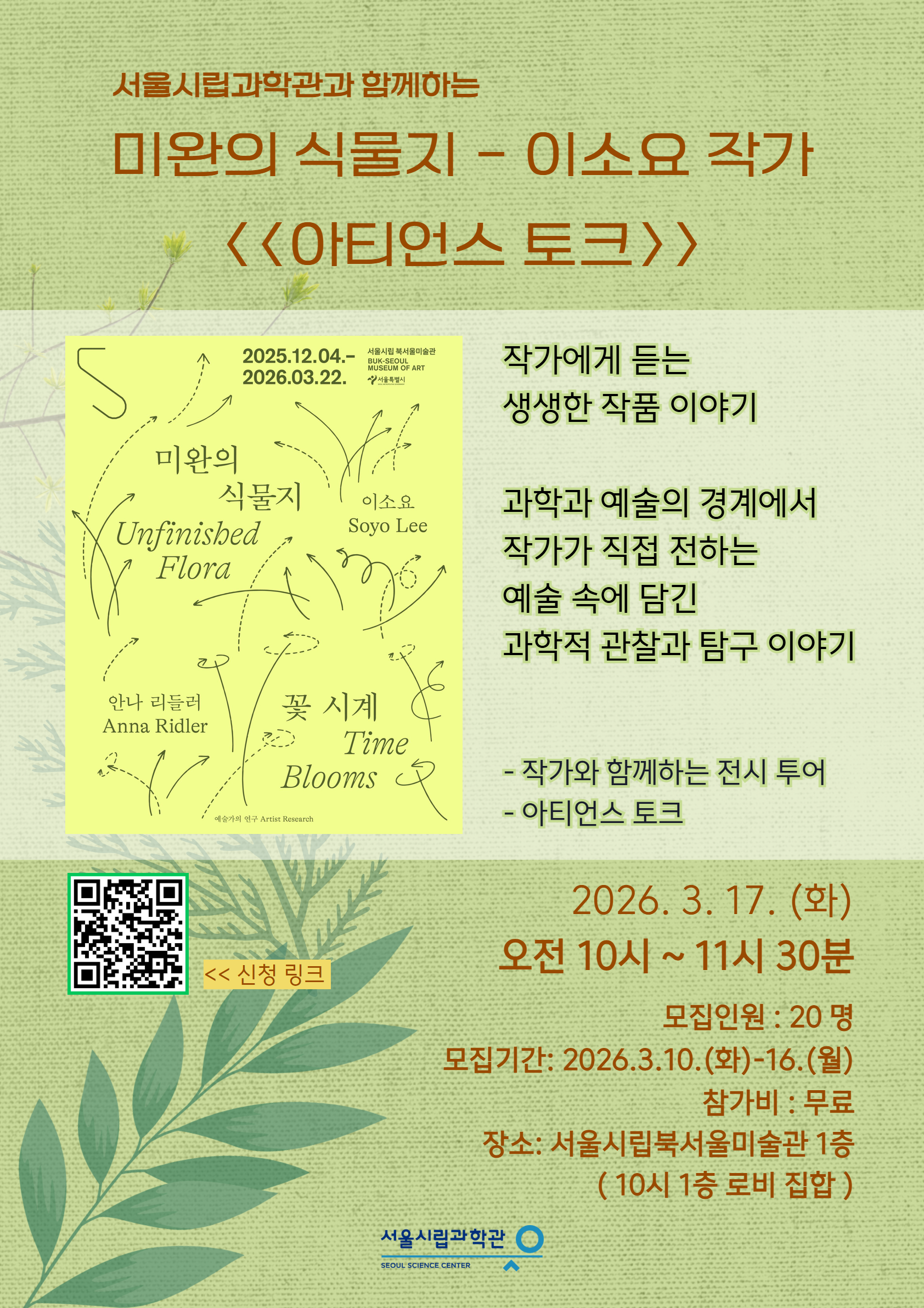예술 속에서 과학을 발견하는 시간, 미완의 식물지 - 아티언스 토크 북서울미술관에서 진행 중인 전시 미완의 식물지를 함께 관람하며 예술 작품 속에 담긴 과학적 관찰과 탐구의 과정을 살펴보는 프로그램! 이소요 작가님과 함께 전시를 둘러보고 작품 해설을 들으며, 작품 제작 과정에 담긴 과학적 관찰과 기록의 이야기를 나눕니다. 예술과 과학이 만나는 흥미로운 순간을 직접 경험해 보세요! 일시 - 2026. 3. 17. (화) 오전 10시 ~ 11시 30분(1시간 30분) 장소 - 서울시립 북서울미술관 1층 (10시 로비 집합) 모집 - 성인 20명 선착순 모집기간 - 2026.3.10.(화) 10:00 ~ 3.16.(월) 18:00 참가비 - 무료 강의 일정표 3월 17일 오전 10시작 10:00 ~ 10:40 - 작가 해설과 함께 전시 관람 10:50 ~ 11:30 - 아티언스 토크 및 질의응답