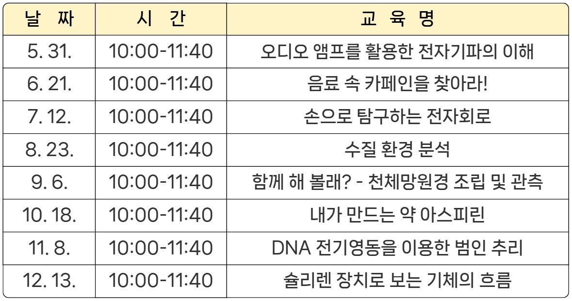 📅 접수기간 : 4월 28일 10:00~ 👥 대상 : 성인 20명 ('8.23/수질 환경 분석', '9.6/함께 해 볼래?' 프로그램은 16명 정원) * 본 수업은 성인대상 수업으로 신청자의 연령이 맞지 않을 시 참여 불가합니다. 💸 수강료 : 1인당 10,000원